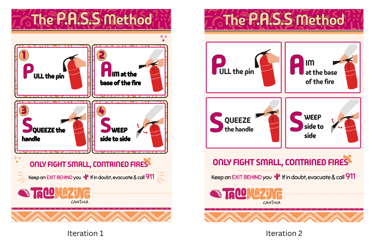 In the scenario, Tacomazing staff have limited experience using fire extinguishers but operate in fast-paced environments where fire risks are present. In an emergency, staff must make rapid decisions with little time for instruction or recall. This creates a need for concise, visible guidance that supports correct action and reinforces when it is unsafe to attempt to fight a fire.